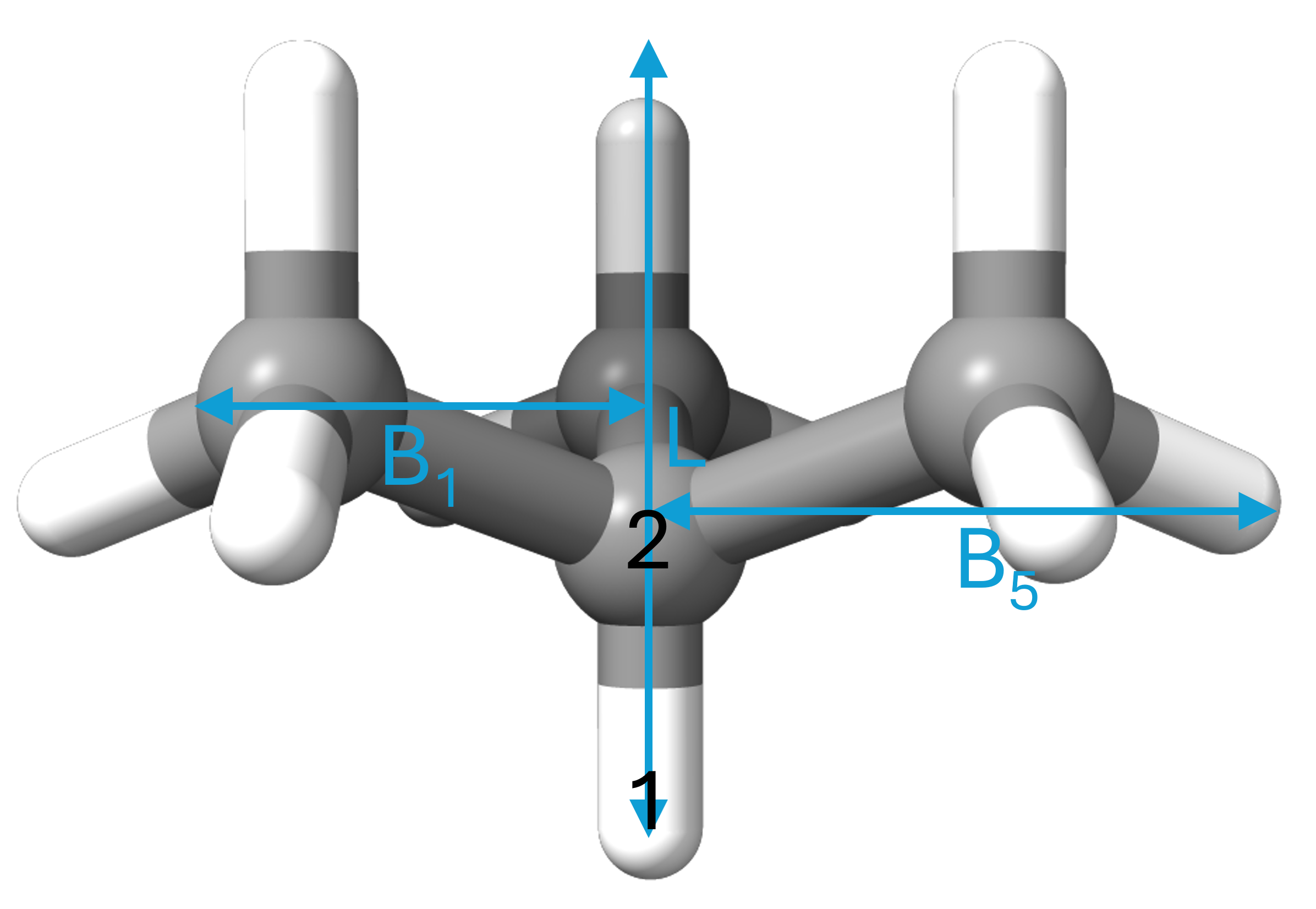 B1 and B5 can be described as the minimum and maximum rotational size of the substituent. They are defined as the shortest and longest vectors from atom 2 to a tangent plane of the vdW surface which are perpendicular to the L vector, respectively.